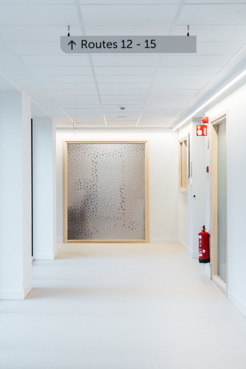 Qua look-and-feel zet de E-vleugel een nieuwe standaard. Zelfs de kleinste details zijn tot in de puntjes geoptimaliseerd. De stijlvolle bewegwijzering is hier een treffend voorbeeld van. We zijn vertrokken van het architecturale ontwerp, dat werd uitgewerkt door Assar Architects. Het interieurconcept is gebaseerd op een opdeling in verschillende biomen – gras, bos, water … – waarbij per verdieping een visueel thema werd vastgelegd. Daar hebben wij vervolgens de bewegwijzering op afgestemd, van eenvoudige veiligheidspictogrammen over richtingsaanduidingen, overzichtsborden en kamernummers tot prints op zowel glazen als volle wanden.